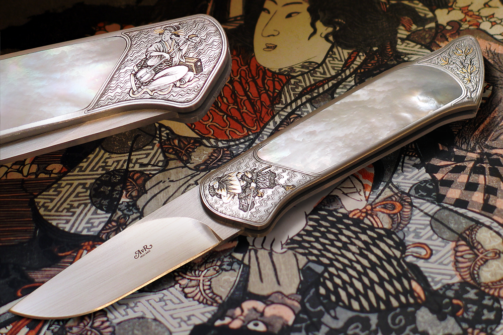 ATS 34 Lock-Back folder with Mother of Pearl inlay. The engraving features a Japanese scene.