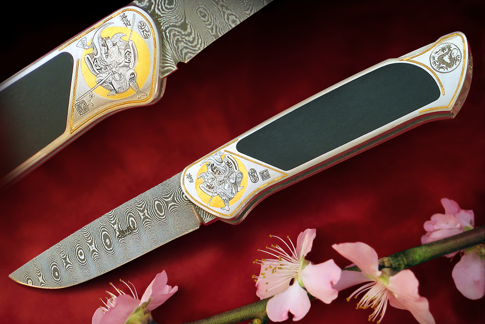 A Damascus steel Lock-Back folder with Jade inlays. The engraving features a Japanese scene.