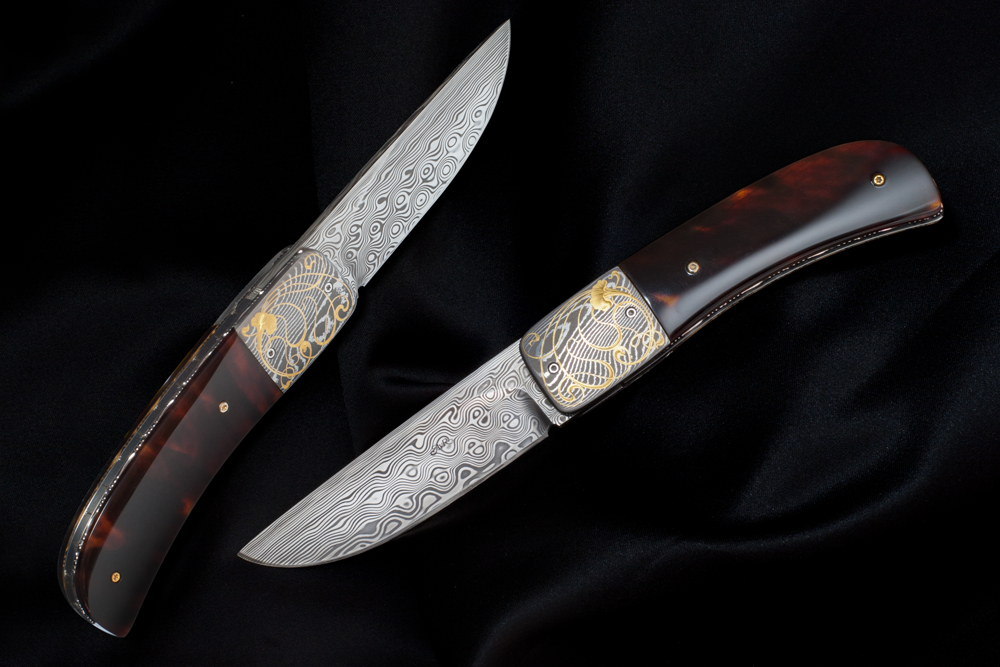 An impressive Lock-back folder that features a Damascus steel blade with Turtle shell handle. Hand carved with titanium liners and 24k-gold engraved bolsters.