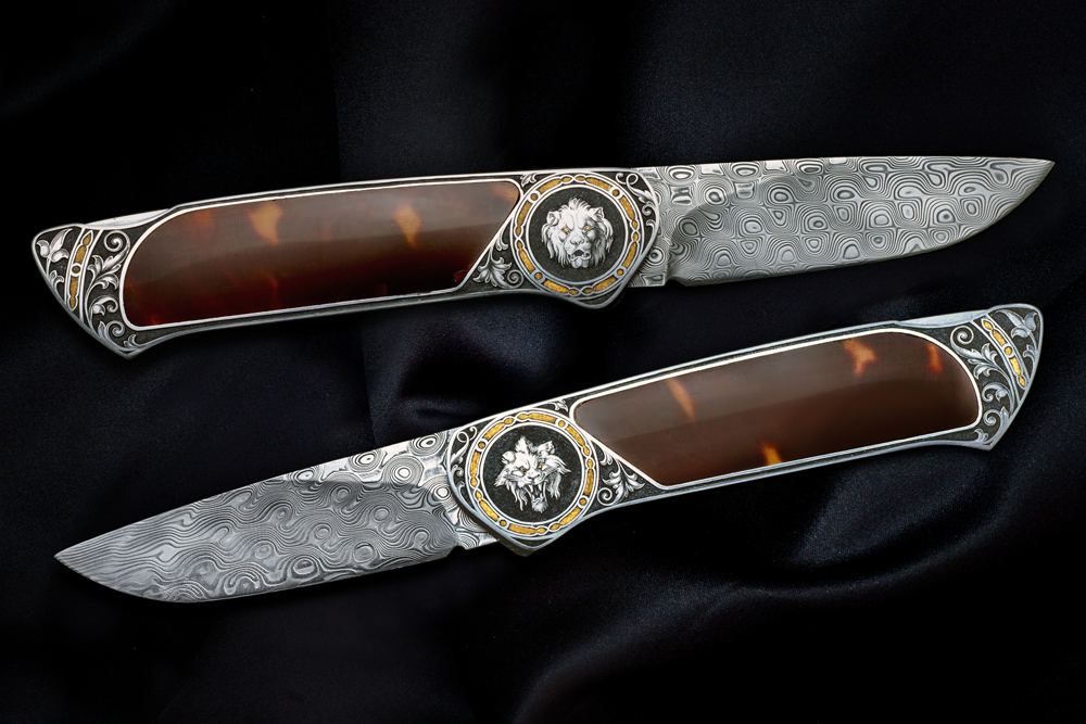 This Damascus steel interframe folder with Turtle shell inlay is engraved