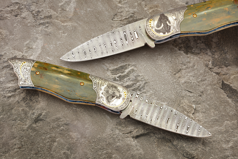 A stainless Damascus linerlock with mammoth ivory. The engraving features a pre-historical scène.