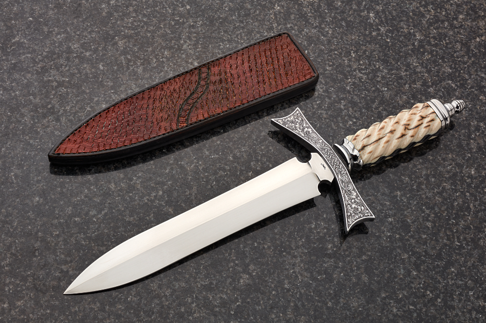 N690 (Böhler) steel Dagger with a total length of 37 cm / 14.6 inch. Buffalo horn and Mammoth ivory handle.