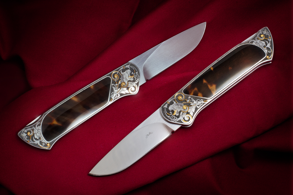 This Damascus steel interframe folder with Turtle shell inlay is engraved